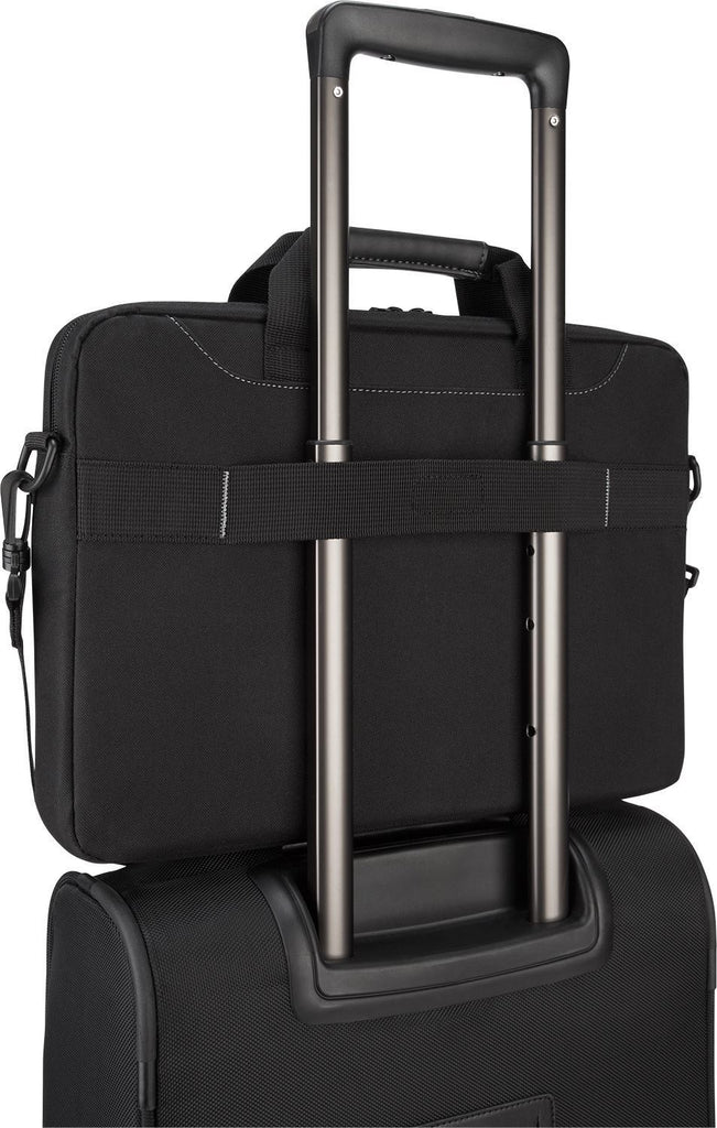 With convenient topload access, a padded laptop compartment and streamlined storage, the Targus Business Casual Slipcase offers everyday protection for laptops up to 15.6”. Slimmer than a briefcase and roomier than a sleeve, the case includes a removable shoulder strap, soft-grip handles and a trolley strap for slipping onto your roller bag for travel. Inside, a padded compartment secures your laptop and keeps documents or magazines handy. Take along a charger, smartphone, and other accessories in the zippered front pocket. A durable mix of fabrics and contrast stitching distinguish this lightweight, thin-profile case.